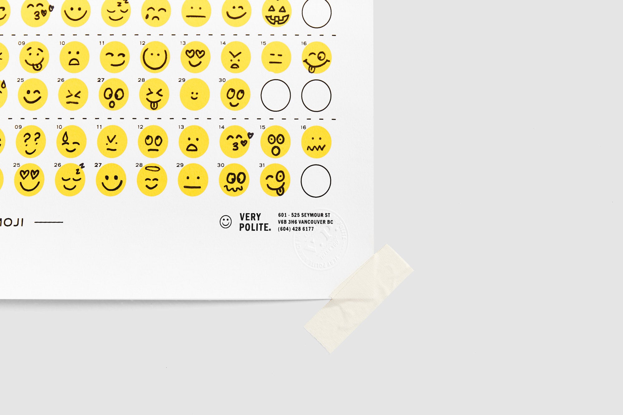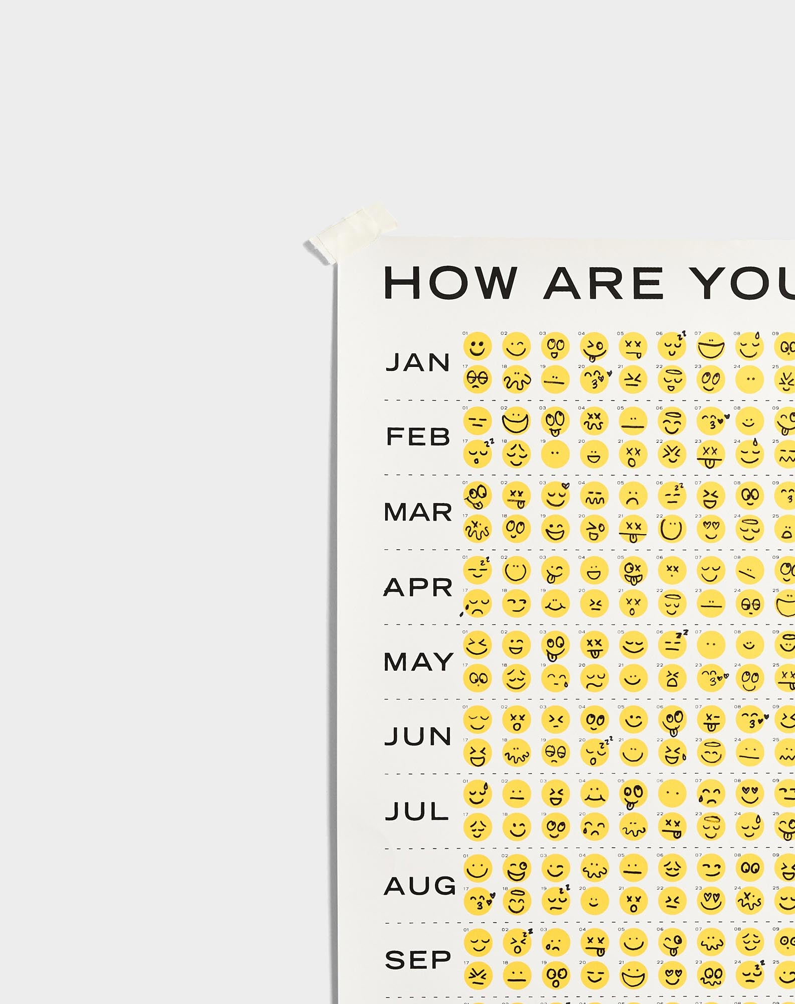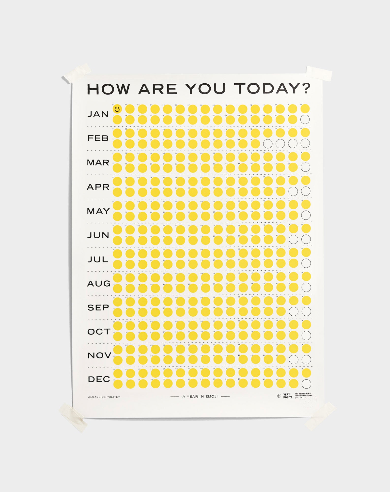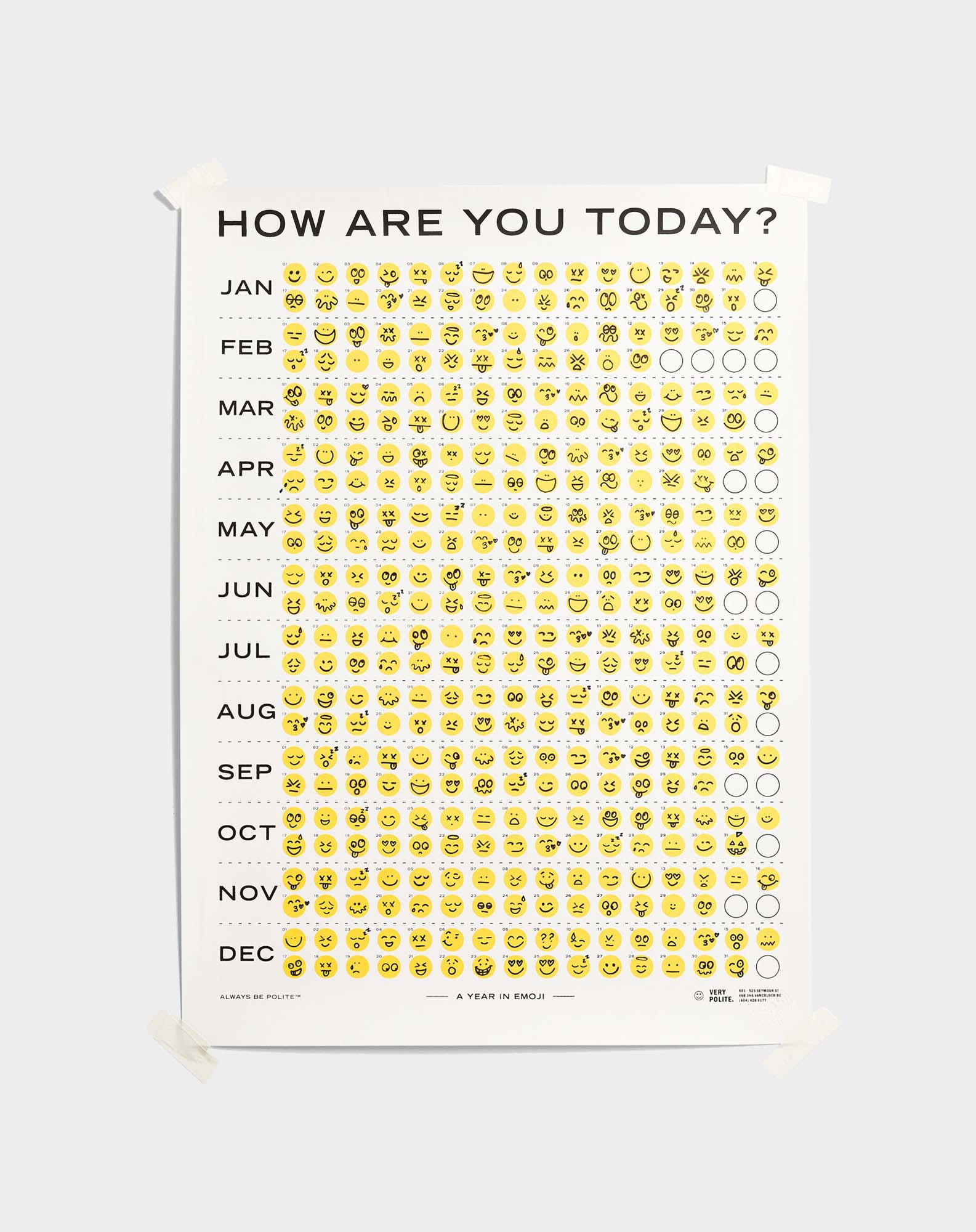 Sometimes an emoji just sums it up. In an era of short and sweet communications, we created a one-of-a-kind calendar for every mood. We left blank circles so that as the year progressed, each emotion of each day would be captured in a simple yet effective way. Happy? Rough day? There’s an emoji for that.